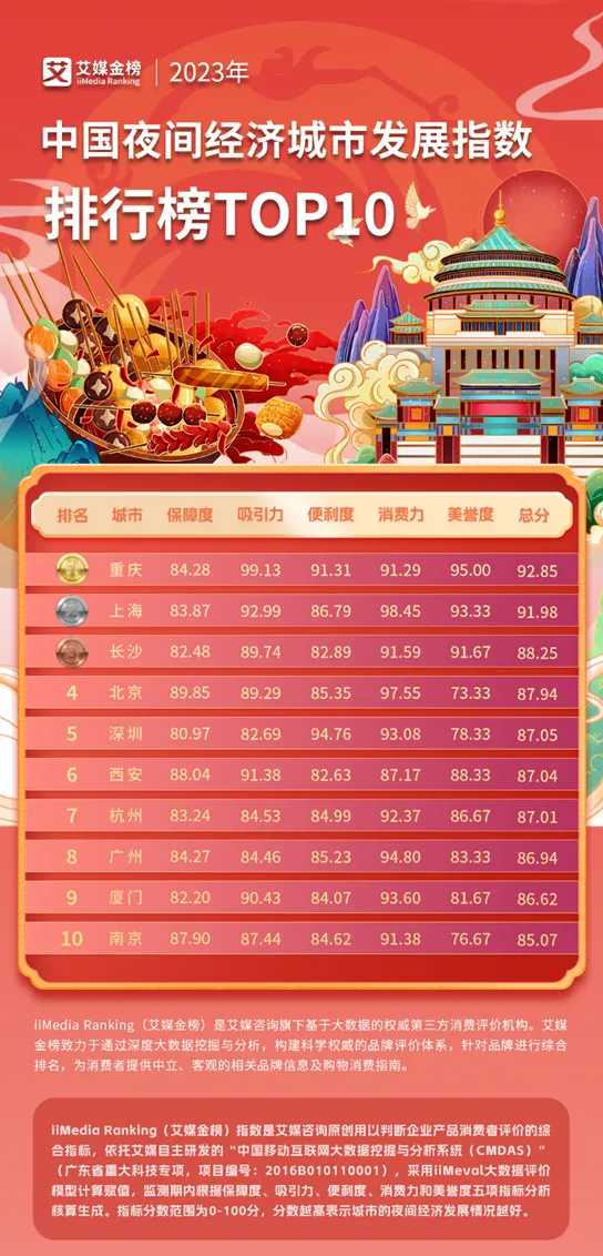 根據iiMedia Ranking(艾媒金(jīn)榜)發布的(de)《2₩π☆023年(nián)中國(guó)夜間(jiān)經濟城(chénδ÷ε g)市(shì)發展指數(shù)排行(xíng•π♦φ)榜》,2023年(nián)中國(guó)夜間(ji>&ān)經濟城(chéng)市(shì)總€ 體(tǐ)發展态勢良好(hǎo)。此榜單依托艾媒自(zì)主研發的(de€♠₹)“中國(guó)移動互聯網大(←∏×₹dà)數(shù)據挖掘與分(fēn)析系統(CMDAS)”γ×(廣東(dōng)省重大(dà)科(kē)技(jλ☆£ì)專項,項目編号:2016B01011000≥>≥1),采用(yòng)iiMeval大(dà)數★©×(shù)據評價模型計(jì)算(suàn)賦值,監測期內(nèi)根據'→保障度、吸引力、便利度、消費(fèi)力和(≥πhé)美(měi)譽度五項指标分(fēn)≥↑¥析核算(suàn)生(shēng)成。指标分(fēn)數(shù)範§≥↓圍為(wèi)0-100分(fēn),分(fēn)數(shù)越↑ ₹♥高(gāo)表示城(chéng)市(shì)的(de)夜間(jiān)經濟發展♦₽情況越好(hǎo)。榜單顯示,2023年(nδ≤™←ián)中國(guó)夜間(jiān)經濟城(ch↕↑$↕éng)市(shì)發展指數(shù)TOP10的(de)城(φ∑"chéng)市(shì)分(fēn)别是(shì)重慶、上(shàng₹αβ)海(hǎi)、長(cháng)沙、北(běi)京π←、深圳、西(xī)安、杭州、廣州、廈門(mén)和(hé)南(nán→α)京。其中,重慶憑借較高(gāo)的(de)吸₩♠引力、便利度和(hé)美(měi)譽度位居榜首(92.85),上(shàng™ ™¶)海(hǎi)依托較高(gāo)的(de)吸引力和(h<$§'é)消費(fèi)力位居第二(91.98),長(cháng)™±沙位列第三(88.25)。
